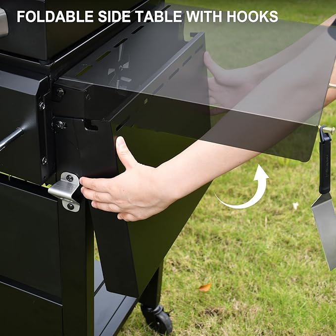 - EFICIENCY MEETS ORGANIZATION: The front panel transforms into a convenient condiment station for organizing seasonings, while dual foldable shelves provide ample space for plates and prep work. Tool hooks keep your grilling essentials within easy reach
