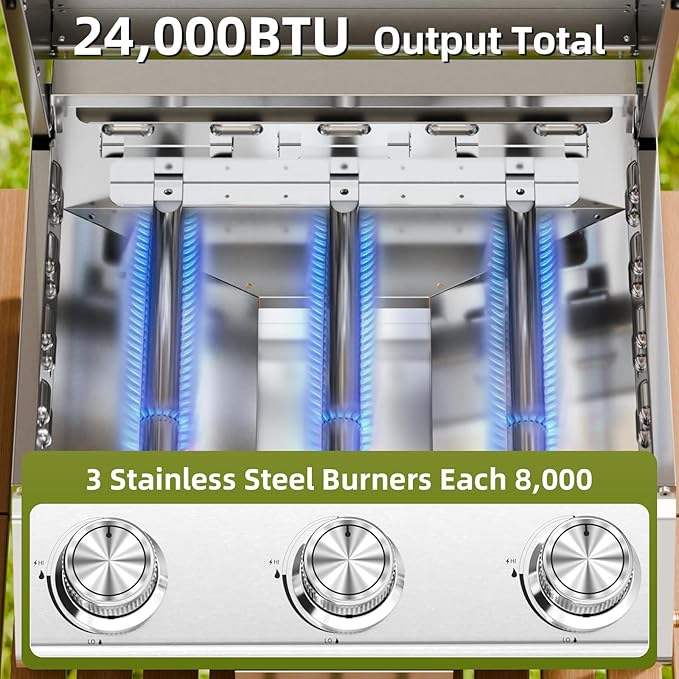 - 3*8,000 BTU BURNERS: Featuring three powerful stainless-steel burners, each with 8,000 BTUs of heat. With twist start ignition and independent control knobs, you can freely control the heat to let your food in a good mood.