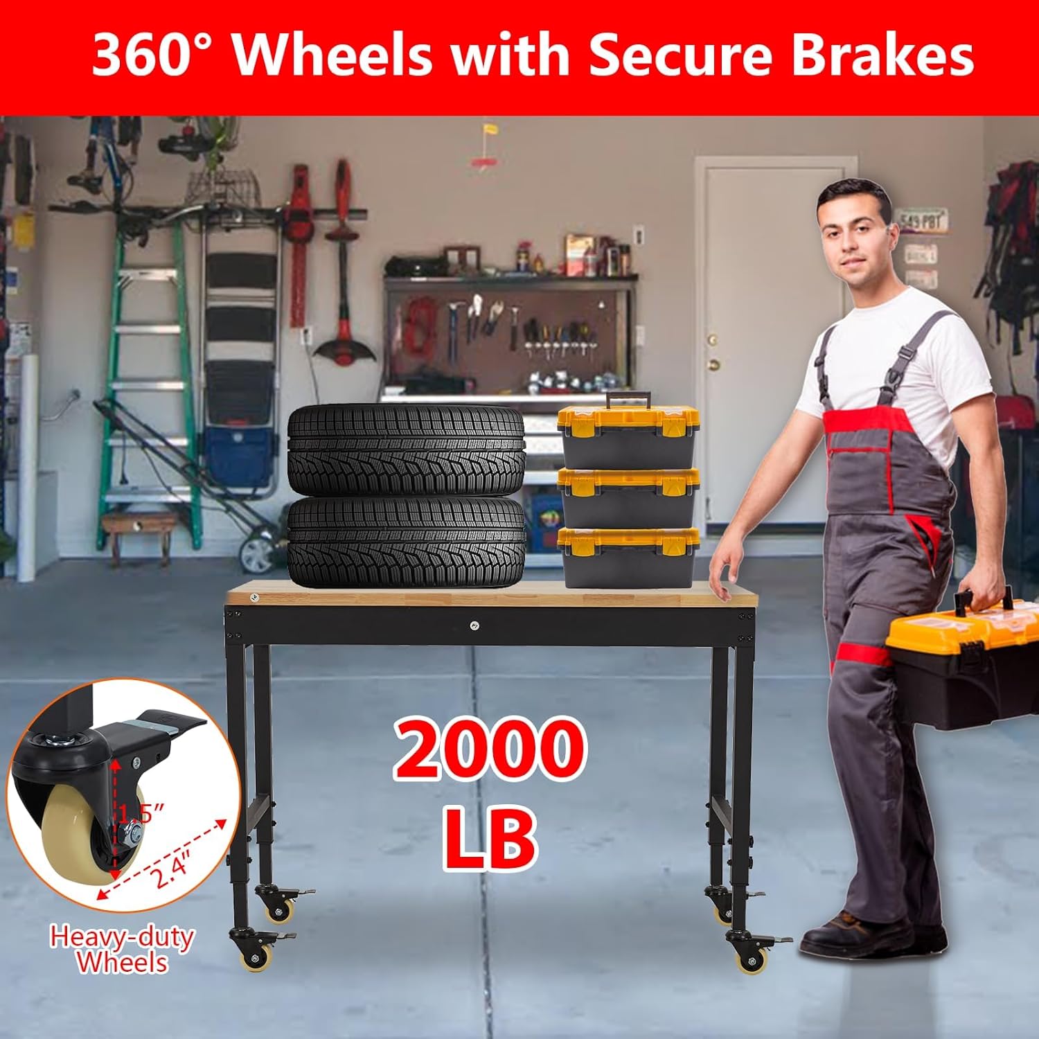 48x24 Inch Heavy-Duty Adjustable Workbench with Rubber Wood Top – 2000LB Capacity Mobile Garage Workstation, Locking Wheels, Power Outlets, Ideal for Workshop, DIY & Tool Storage (Black)