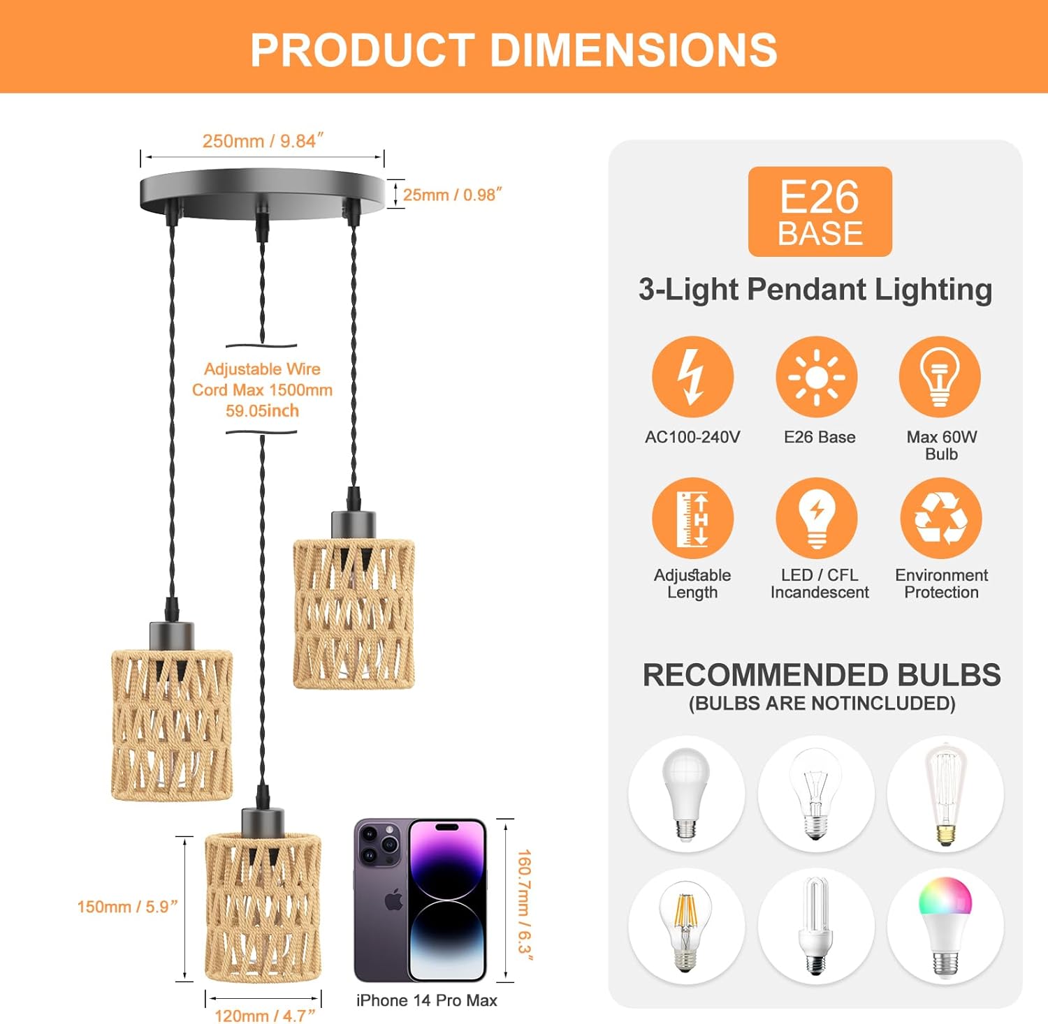 - ✨ 【Hand-Woven Rattan Shade & Boho Style】This farmhouse pendant light features a 100% hand-woven natural rattan shade,offering a durable,eco-friendly,and stable design.The boho pendant light effortlessly complements farmhouse,bohemian,vintage,and industrial decor,adding natural warmth to any space.When lit,the woven rattan shade casts stunning shadow patterns,creating a cozy ambiance in your kitchen island,dining room,or bedroom.