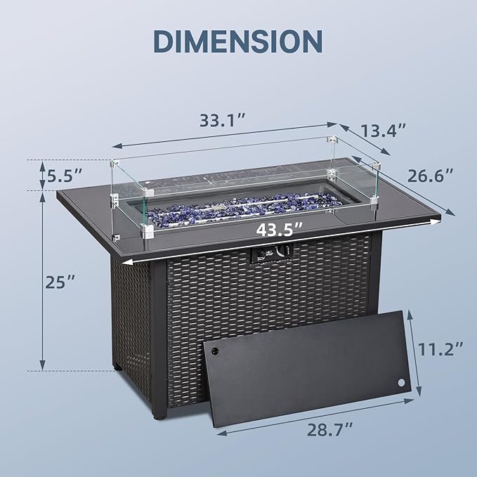- 60,000 BTU CSA-Certified Fire PitTable: Elevate your outdoor gatherings with our 43" propane fire pit table, engineered to deliver up to 60,000 BTUs of comforting heat—perfect for extending your backyard evenings well into cooler seasons. The stainless steel lid doubles as a functional dining surface, seamlessly transitioning from fire pit to table. Please note that the gas tank and propane should weigh less than 20 pounds, and the gas tank itself is not provided
