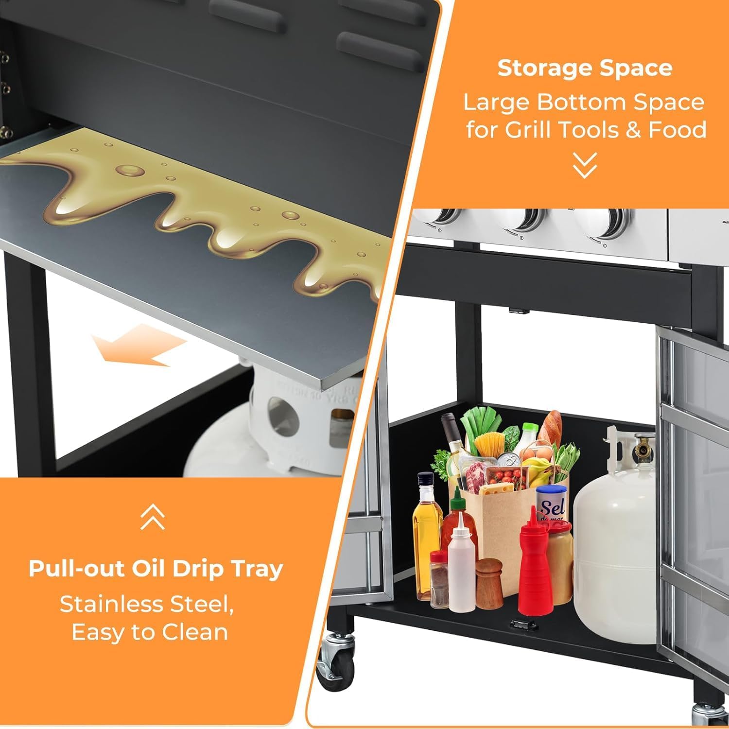 4 Burner Gas Grill with Side Burner, Dual-sided Frying Pan, Built-in Thermometer, Wheels, Side Table, Stainless Steel Burner, 47,000 BTU Outdoor Grill for Patio, Garden, Balcony
