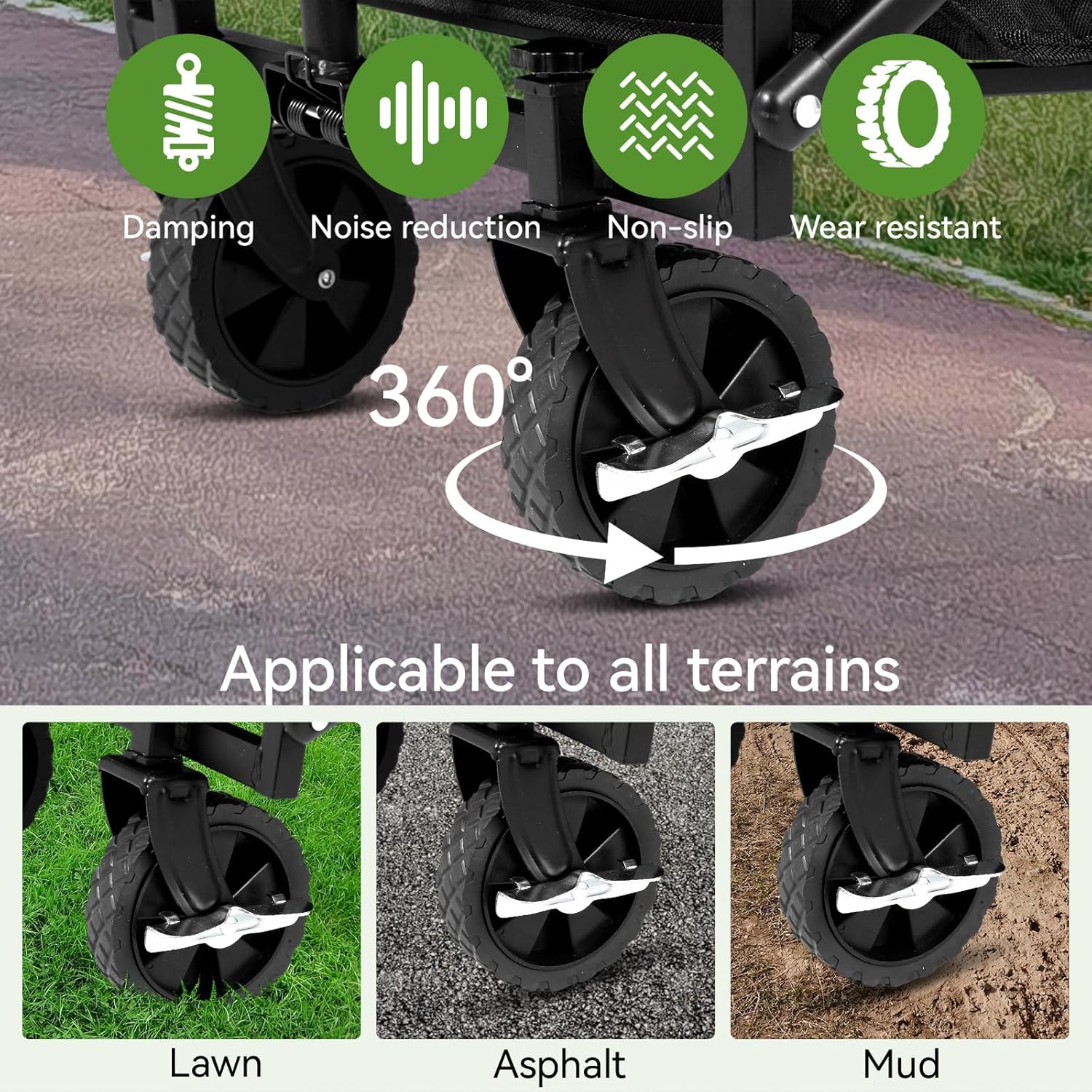 - High-quality materials & sturdy structure:This folding wagon cart features a reinforced steel frame and 600D waterproof Oxford fabric for durability. Equipped with thickened springs and 360° rotating front wheels with brakes, it offers easy maneuverability on any terrain, making it a reliable all terrain wagon.The tires and Oxford cloth are designed to be detachable, making cleaning and storage a breeze