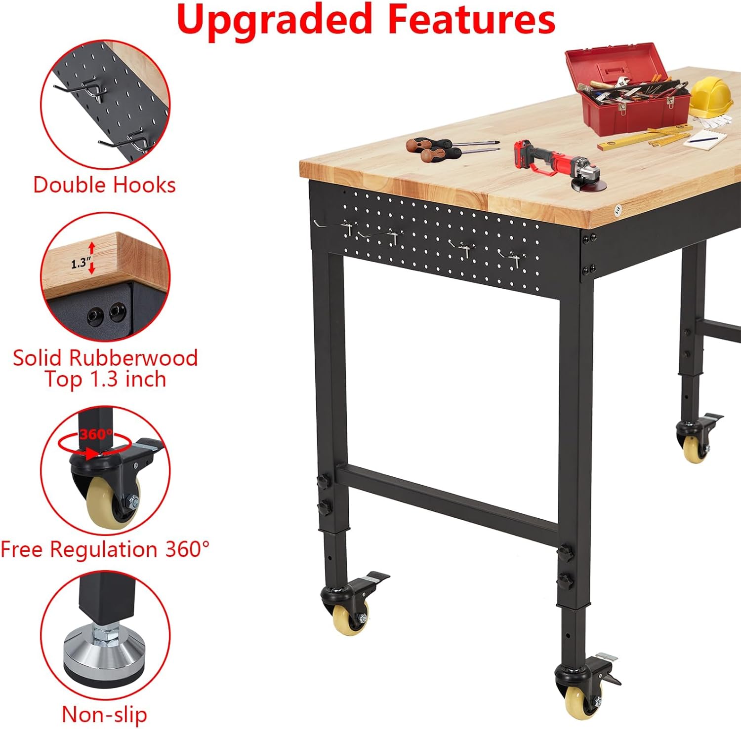 - 【Solid Rubberwood and Thick Steel Leg Construction】Coating and Durability: Finely coated and polished for long life and easy cleaning. 1.3mm thick steel frame for robust support. Supports up to 2000 lbs, ideal for heavy-duty tasks like auto repair and gardening.