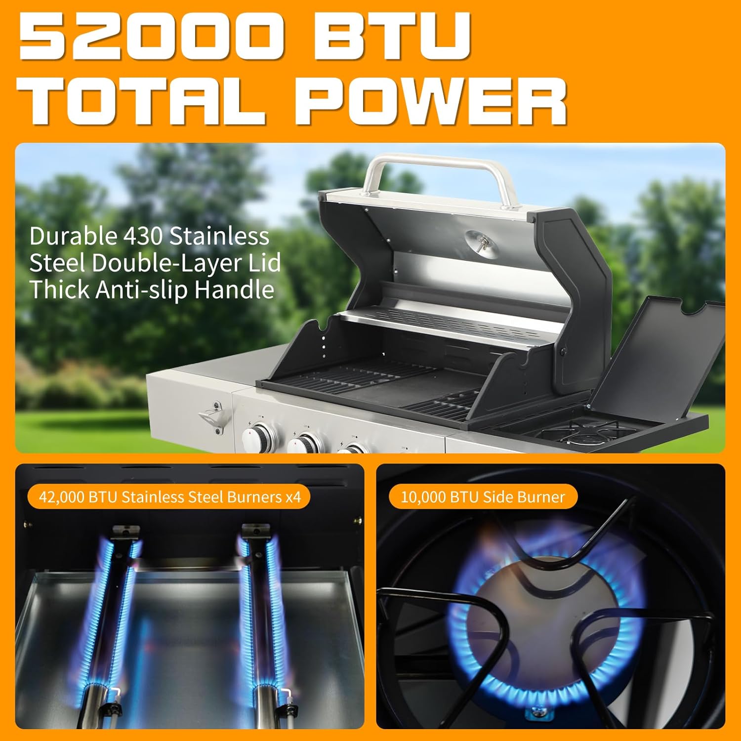 - Multi-Burner Control-52,000 BTU Total:Gas grill with searing burner,four main stainless steel burners(10,500 BTUs each) and a side burner (10,000 BTUs)heats up fast while featuring independent piezo ignition for safe grilling. knob middle with heat-resistant soft rubber ring, ensuring comfortable and safe operation even during extended cooking sessions. High-temperature-resistant (800Β°C) enamel flame tamper plates distribute heat evenly and built-in thermometer helps monitor internal temperature precisely,perfect for slow roasting or high-heat searing.