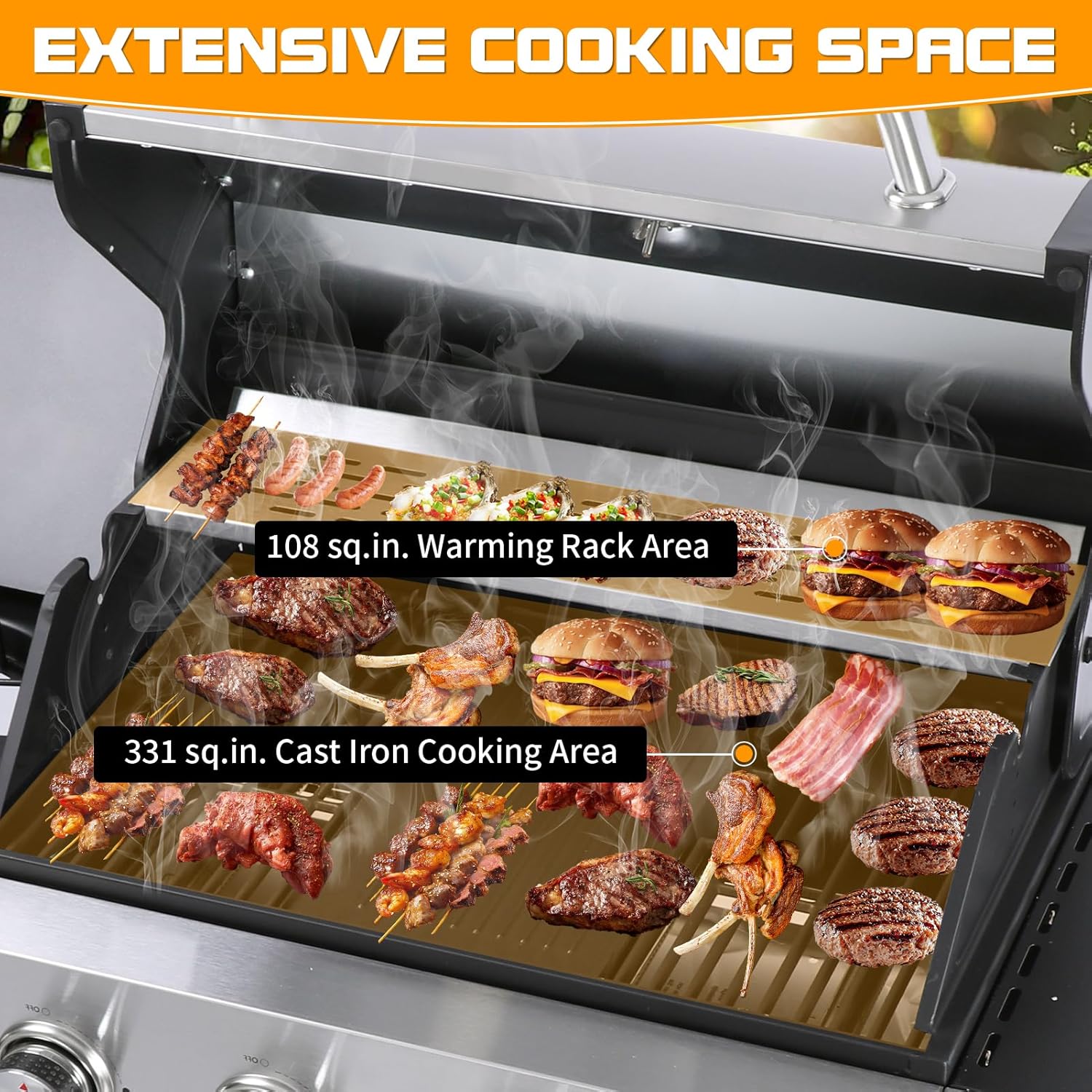 - Ample Cooking Space for Family and Friends:The 4-Burner propane gas BBQ grill with a total cooking area of 439 square inches (331 square inches of main cooking area and 108 square inches of warm area). Whether grilling steaks, burgers, veggies, or seafood, spacious cooking area providing plenty of room for family meals or weekend gatherings without crowding. Ideal for outdoor barbecue grill,like backyard,garden,courtyard, terrace and balcony.(Only For PROPANE GAS!!!)
