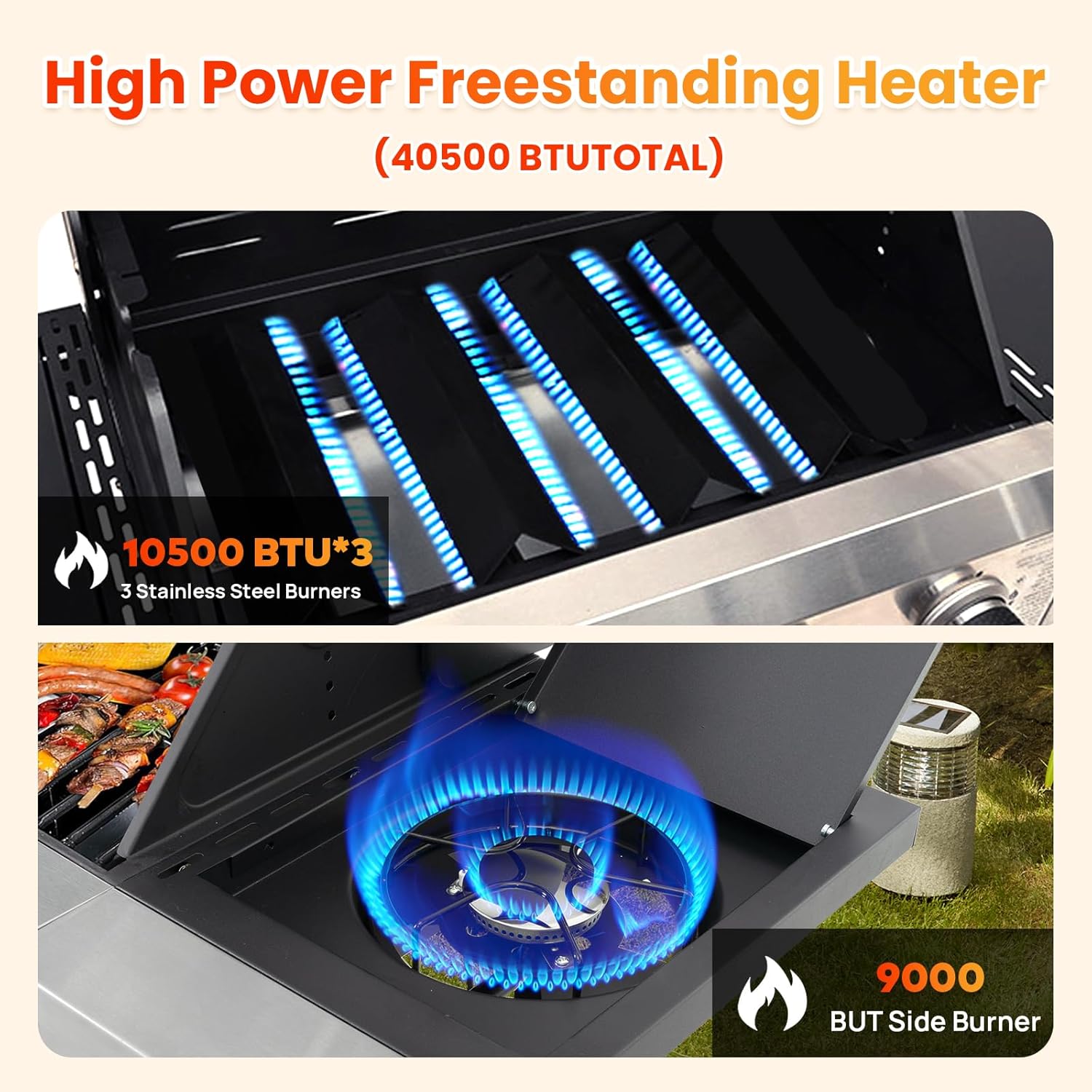- 🔥 High-Performance Stainless Steel Burners - This propane gas grill features 3 powerful stainless steel burners and side burner delivering a total of 40,500 BTU per hour. With a built-in piezoelectric ignition system, you can enjoy instant start-up—just push and turn the control knob. It’s reliable, efficient, and ready to fire up your outdoor meals in seconds.