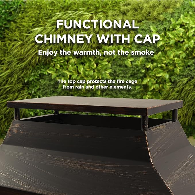 - Rain & Spark Protection: Our chiminea outdoor fireplace features a tower-style chimney with rain cover to shield flames, plus mesh screens to contain sparks. Enjoy safe wood burning in your fire pit without obstructing the beautiful fire view.
