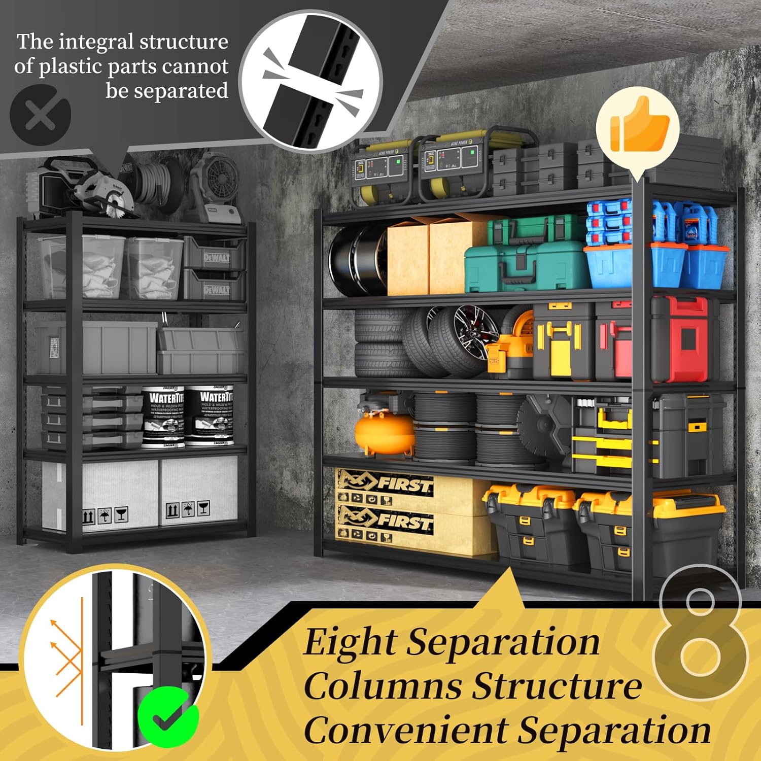 - Sturdy and Durable Construction: Built with high-quality metal and reinforced with double-thickened legs and an anti-rust coating, this shelving unit offers exceptional strength. Each shelf can hold up to 600 lbs, with a total weight capacity of 3003 lbs, making it ideal for heavy-duty storage needs.